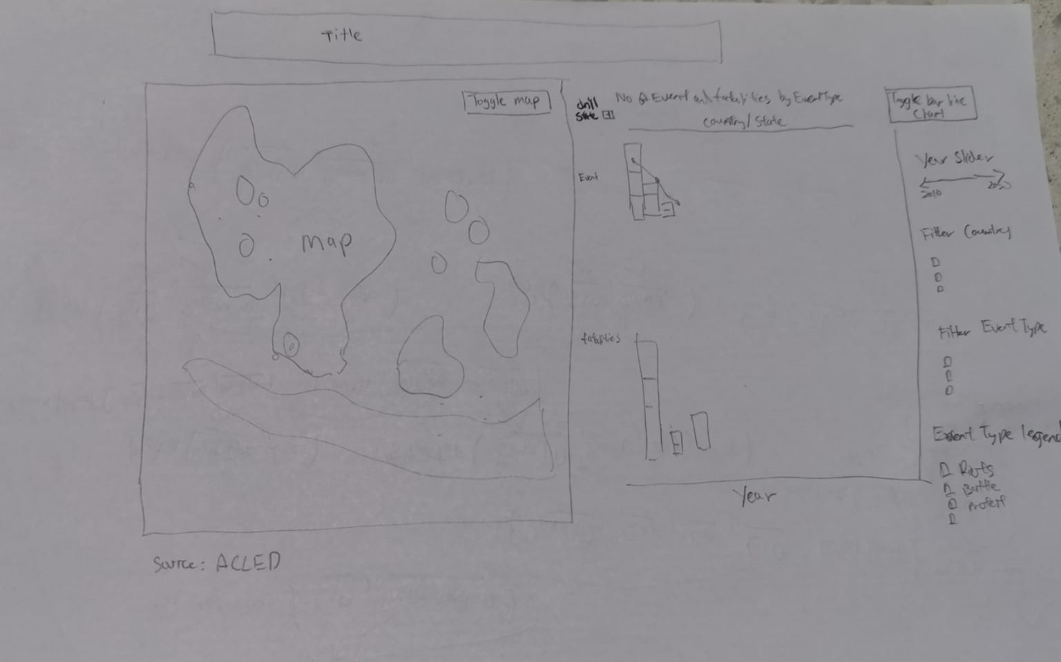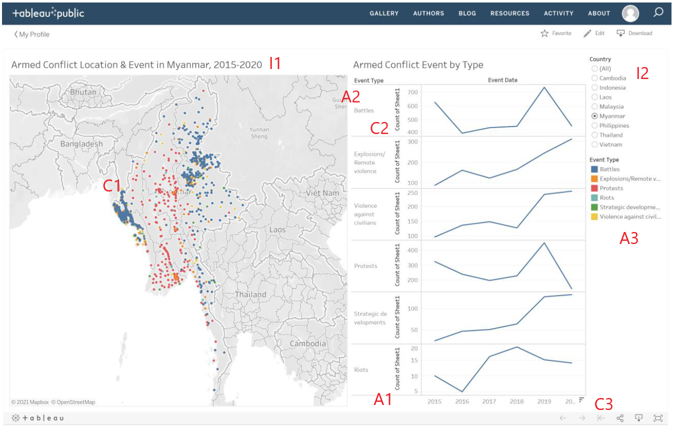 | C1 | Solid color dots in the dot plot are overlapping. As such it is challenging to visualize especially the cluttered area where we do not know how many dots are underneath. Dot plot has its advantage to know the exact location of each event. | To use a proportional symbol map with transparency and size of the circle to represent the amount to make it clearer and easier to extract the numbers as we do not need to count each individual dot. To add on more details and improve clarity using Bar chart and making use of tooltips. Besides, adding a toggleable density heatmap would retain the exact location of each event and provide a different perspective on the concentration of events(filterable) which in the current dot plot is hidden. Toggleable Proportional Symbol pie chart map would also provide an overview by country or state of the breakdown overview. |