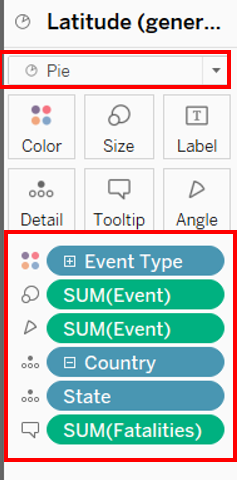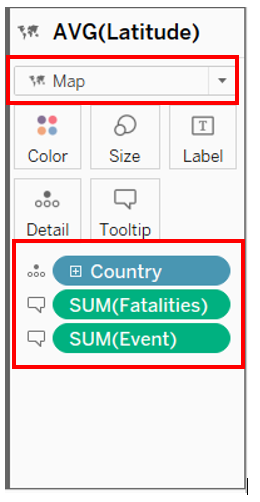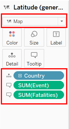 | 9 | Proportional Piechart Map | Create Country Map | • Drag Latitude to Rows again to create a new chart • Change Mark to Map • Drag Country to detail • Drag Event and Fatalities to Tooltip • Click Color change Opacity to 85% • Click from rows Latitude (generated) to Dual Axis to combine the two charts. |