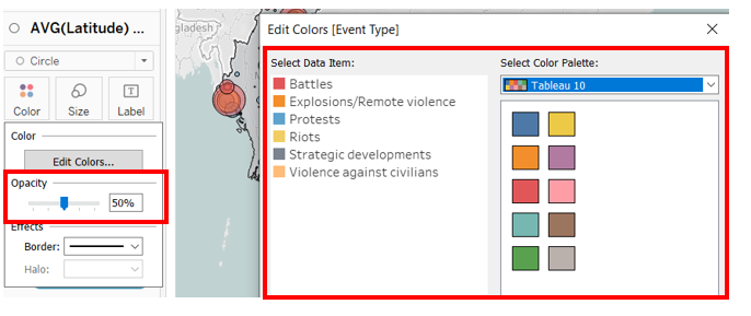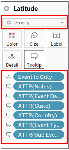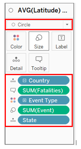 | 5 | Proportionalsymbol map | Create Proportionalsymbol Map | • Drag Longitude and Latitude to Columns and Rows • Change Mark to Circle • Drag Country and State to Detail • Drag Fatalities to Tooltip • Drag Event Type to Color • Drag Event to Size • Click Color and change Opacity to 50% and respective Event Type Color with Tableau 10 |
