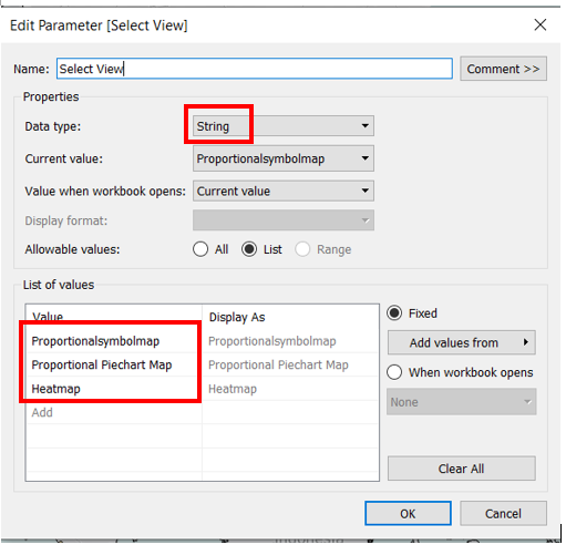| 11 | Proportionalsymbol map | Create parameter for Map toggling | • Create new parameter Select View • Change Data type to String • Click list and enter the names of the three map worksheets as shown. |