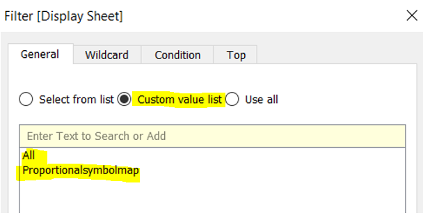 | 12 | Proportionalsymbol map | Create Calculated Field for Map toggling | • Create new Calculated Field Display Sheet [Select View] • Drag the newly created field Display Sheet to Filter • Select Custom Value list and Enter All and the SheetName Proportionalsymbolmap • Repeat this step to Proportional Piechart Map and Heatmap • Use show parameter and test the parameter selection. • The respective chart will only appear when the sheetname is selected. |