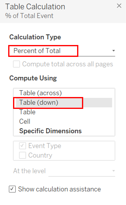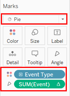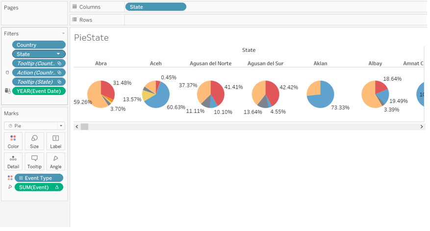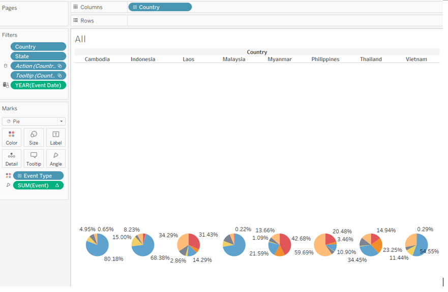 | 13 | PieCountry | Create Country Pie chart for Tooltip | • Create new worksheet name PieCountry • Drag Country to Columns • Change Mark to Pie • Drag Event Type to Color and Event to Angle • Edit Calculation for Sum(Event) as shown • Click Label to show Mark • The pie chart is complete to use to show country Pie chart in tool tip |