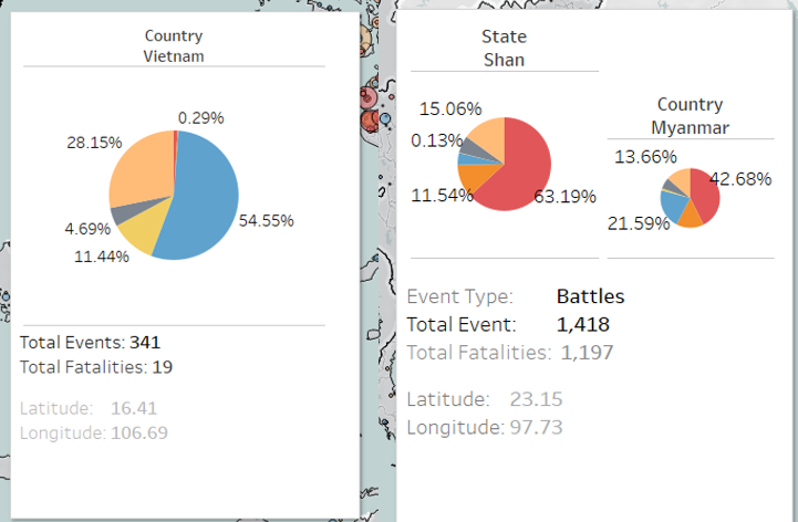 | 16 | Proportional Piechart Map | update tootip | • Map Tooltip Total Events: <SUM(Event)> Total Fatalities: <SUM(Fatalities)> Latitude: <Latitude (generated)> Longitude: <Longitude (generated)> • Pie Tooltip Event Type: < Event Type > Total Event: <SUM(Event)> Total Fatalities: <SUM(Fatalities)> Latitude: <Latitude (generated)> Longitude: <Longitude (generated)> |