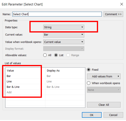 | 17 | Bar & Line | Create parameter for Chart Toggling | • Create new worksheet Bar & Line • Create parameter for Bar and Line Chart Toggling. • Create new parameter Select Chart • Change Data type to String • Click list and enter Bar, Line, Bar & Line |