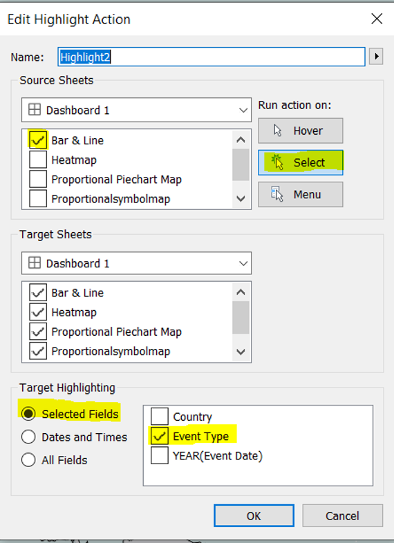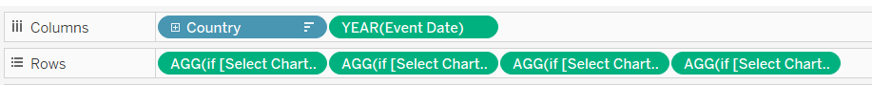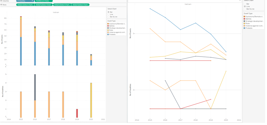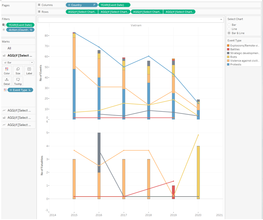 | 19 | Bar & Line | Update Tooltip | • Update the Tooltip as follows. Number of events to insert using the respective Country: < Country > Event Type: < Event Type > Year of Event Date: <YEAR(Event Date)> Number of Events: <AGG(if [Select Chart] <<>> “Line” then sum([Event])else null END)> Number of Fatalities: <SUM(Fatalities)> |