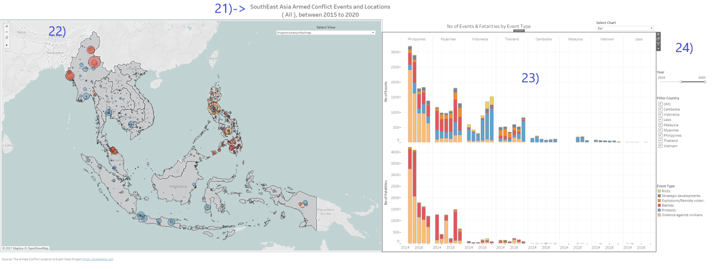 | 21 | Title | Create dynamic Title for dashboard | • Create title worksheet • Drag Event date and country to Mark • Edit title to SouthEast Asia Armed Conflict Events and Locations ( < Country > ), between <YEAR(Event Date)> |