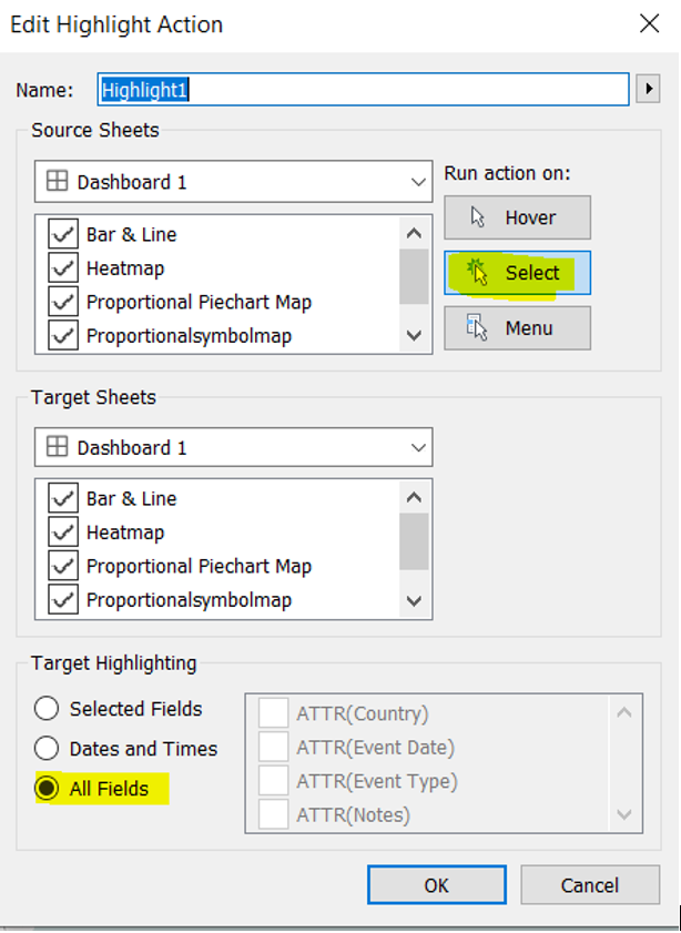 | 25 | Dashboard | Create Actions for interactivity | • Under dashboard -> action, create new highlight action • This will allow interactive highlighting across the charts. |