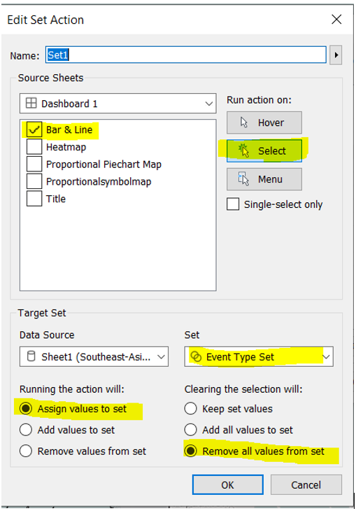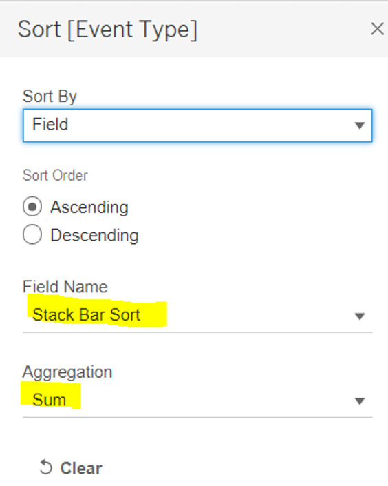 | 26 | Dashboard | Create on-the-fly stackedbar chart with highlight | • Create Calculated field Stack Bar Sort with value IIF([Event Type Set],1000000000,[Event]) • Create event type set by Right click event type -> create -> Set • From event Type legend go to sort and sort by the following settings. • Under dashboard -> action, create new Set action with the following settings. • Lastly Under dashboard -> action, create new highlight action • Now click on the bar chart and you will see the bar reorder on the fly based on selection and the map will also be highlighted by the event type |