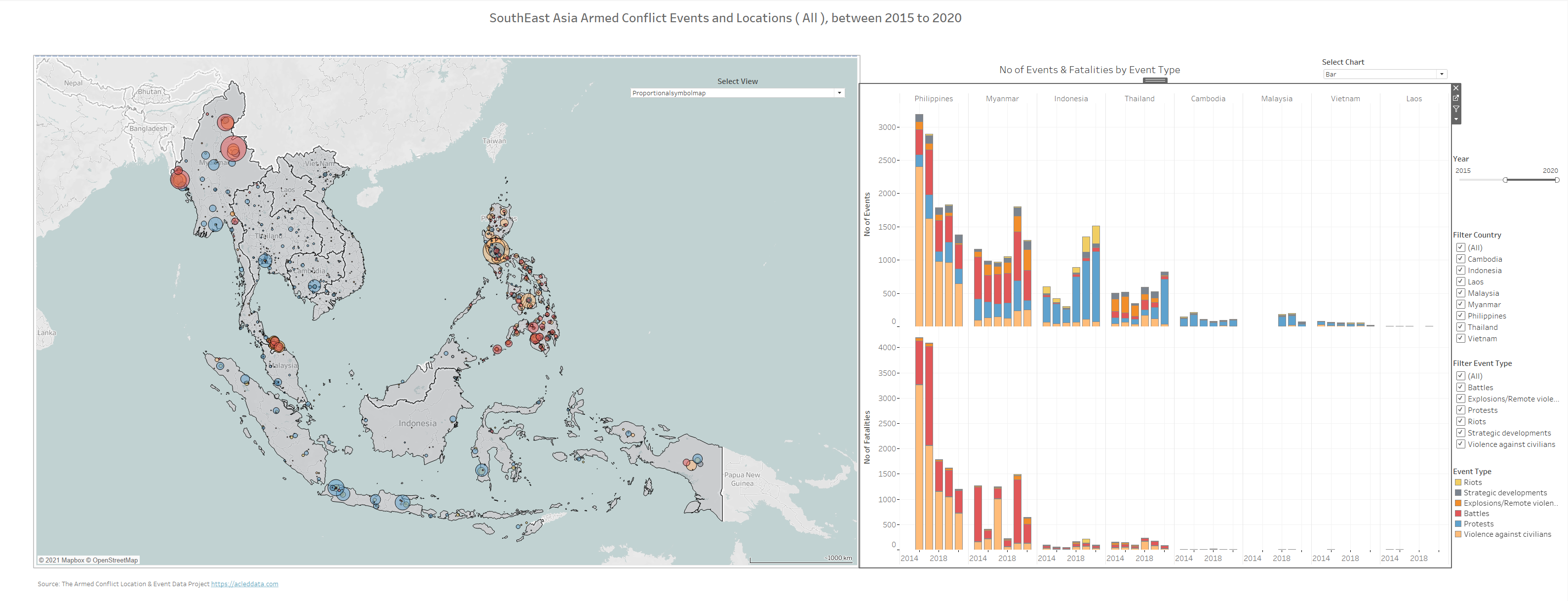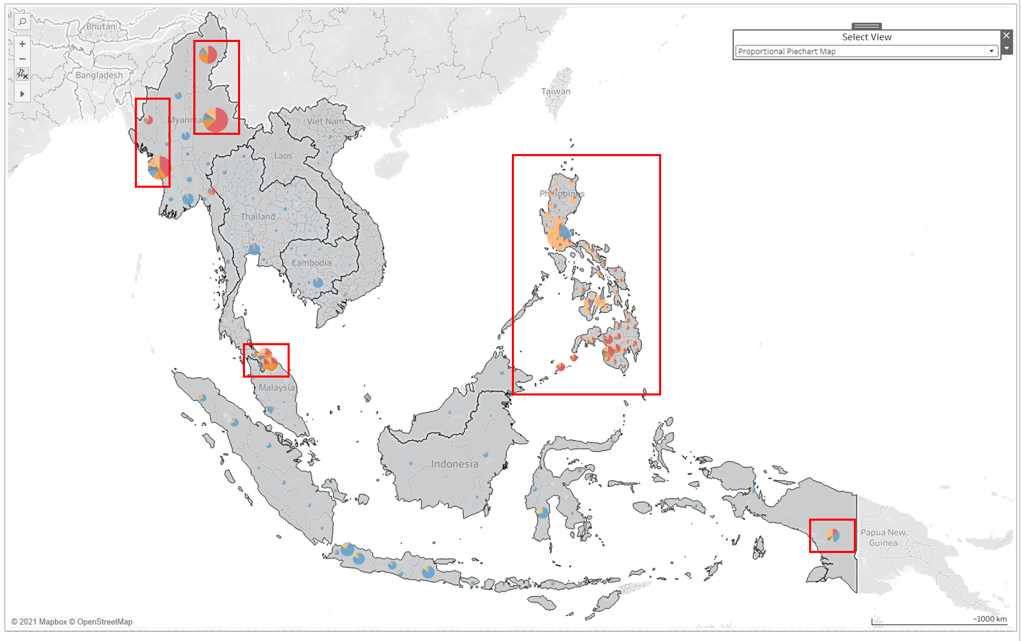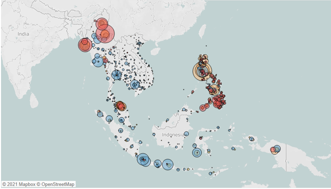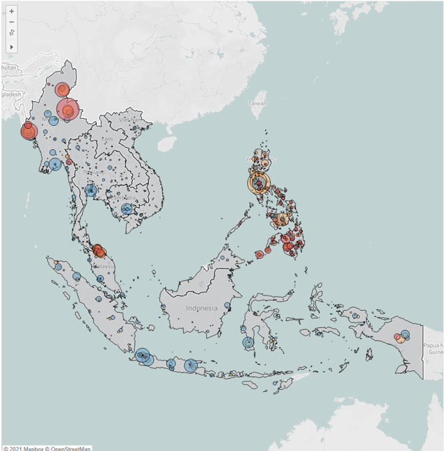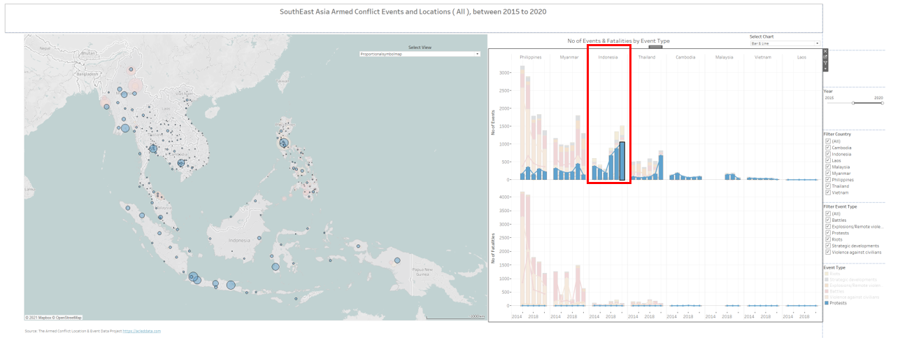 From the Proportional PieChart Map, we can easily see the type of events overview in the Southsea Asia region, from 2015-2020. In the north, we have the warring states Myanmar observed its borders having battles(red) and explosions(orange) events with protest(blue) in the central states.