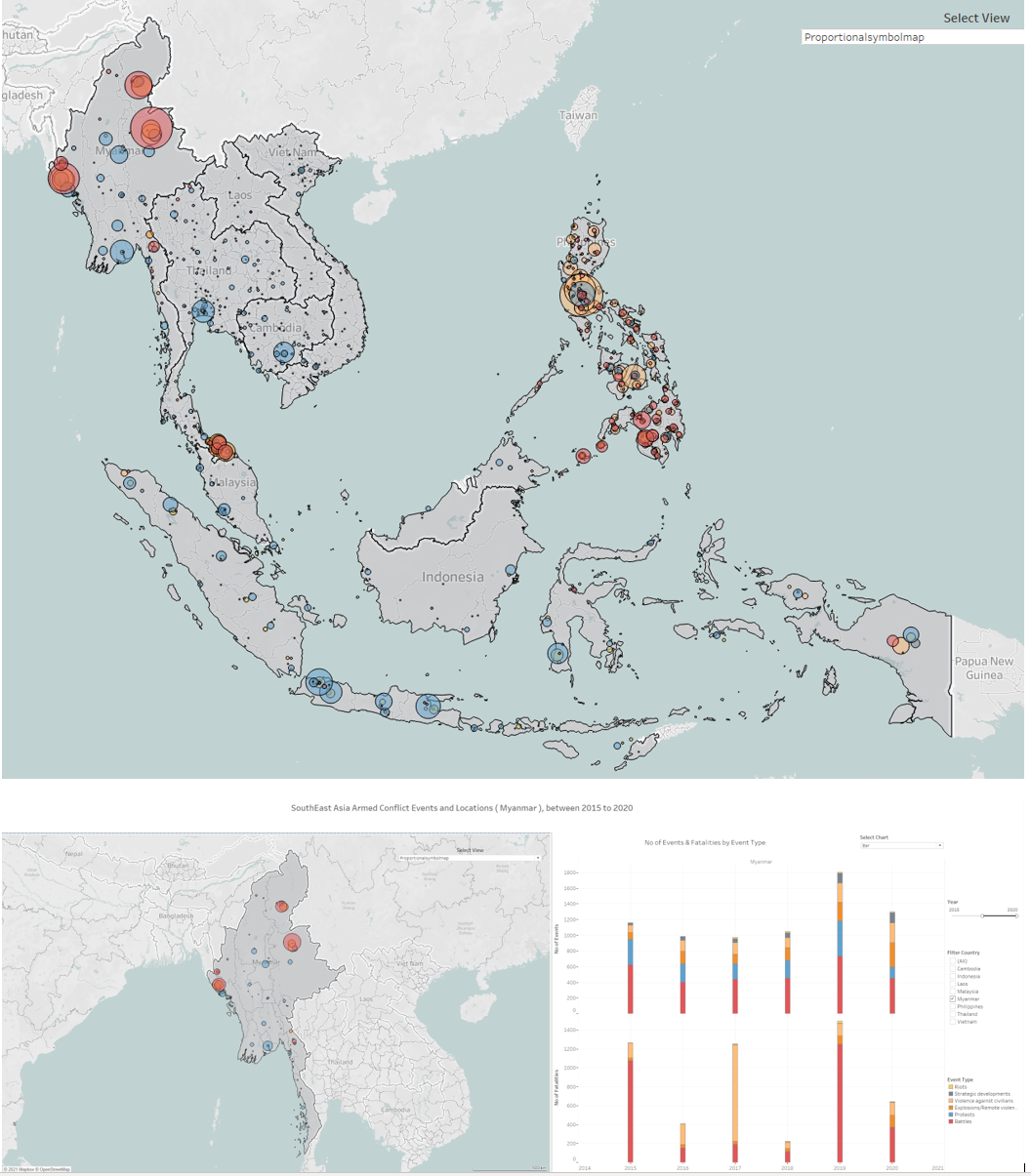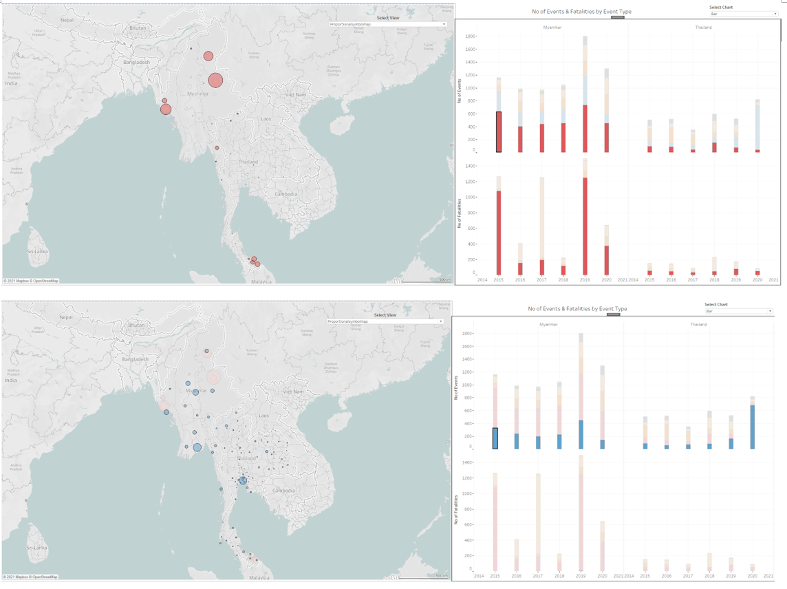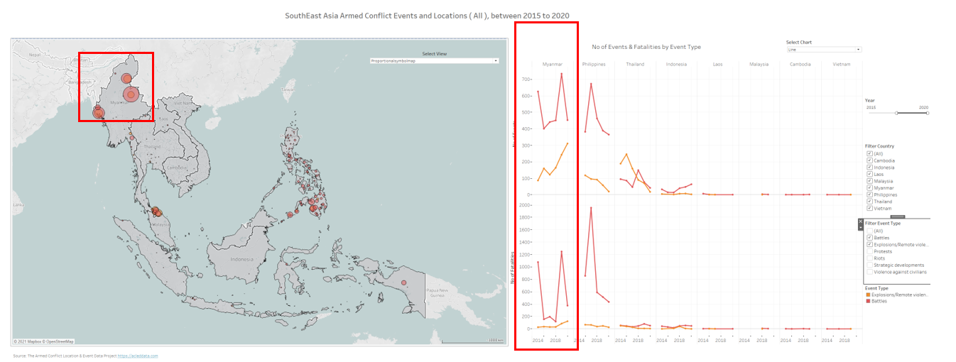 From the Proportional PieChart Map, we can easily see the type of events overview in the Southsea Asia region, from 2015-2020. In the north, we have the warring states Myanmar observed its borders having battles(red) and explosions(orange) events with protest(blue) in the central states.