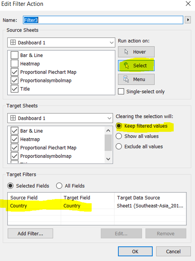 | 27 | Dashboard | Create Map zoom in filter | • Finally, to allow clicking on the county map shape to filter and zoom into the specific country • create filter action with the following • Click on one of the country e.g Myanmar and Map chart will zoom in while the bar chart will filter out. |