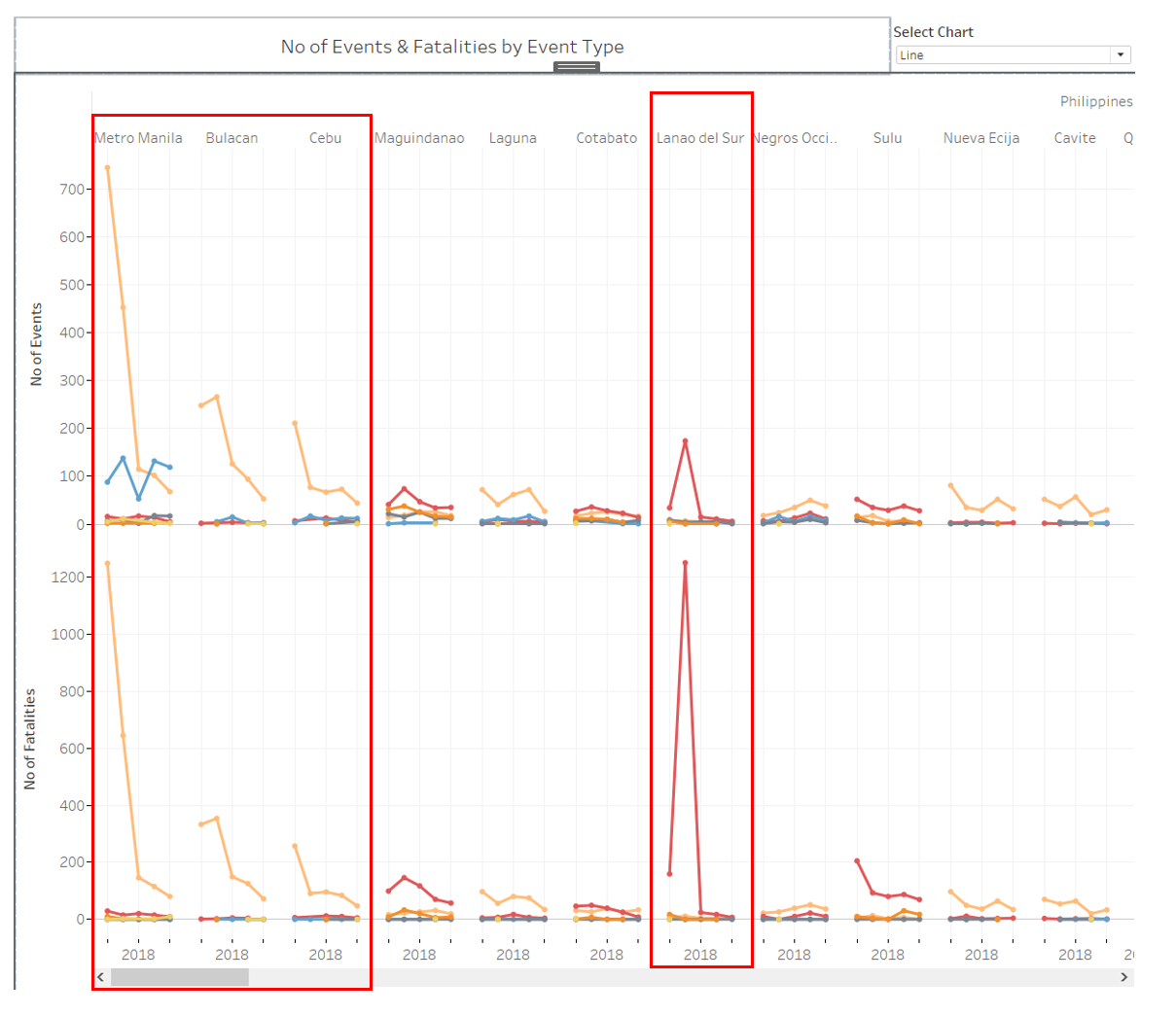 Drilling into the Philippine’s states, In fact the majority of the events and fatalities happened in a few key states such as Metro Manila, Bulacan , Cebu and Lanao del Sur, with others spread across the nation as shown in the line chart.