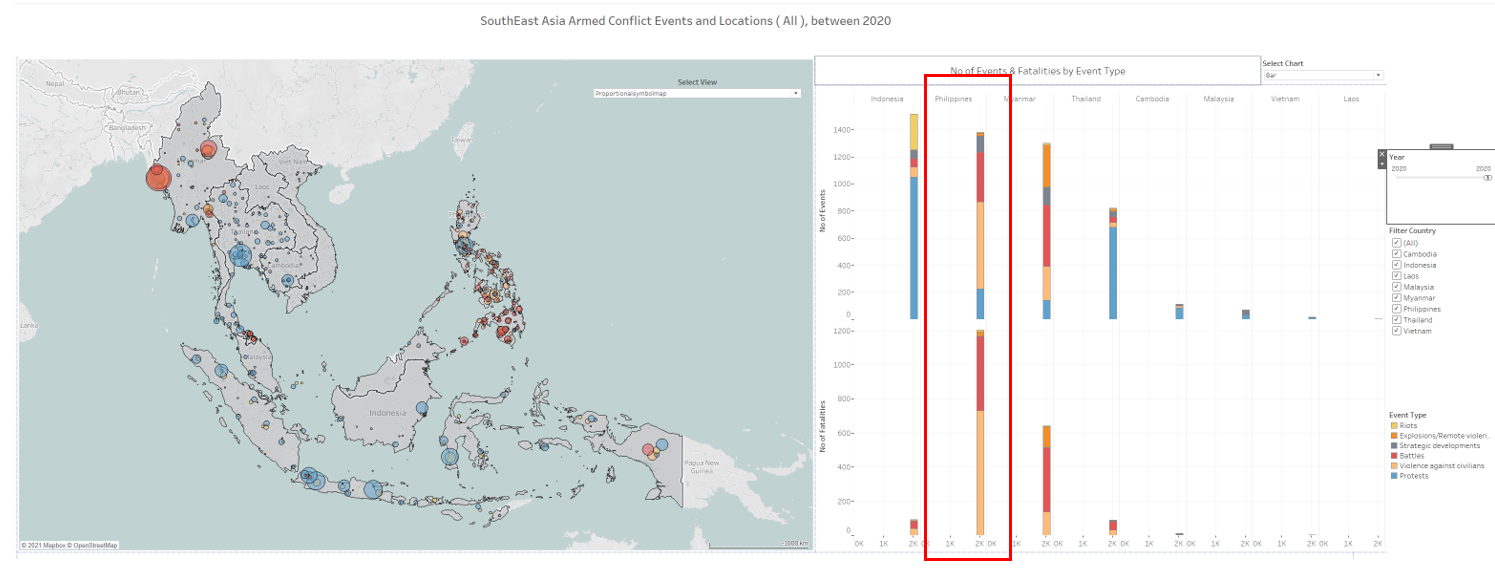 Philippines is mostly having events of Violence against civilians (beige color) with its south mixed with a high number of Battles and explosion events.