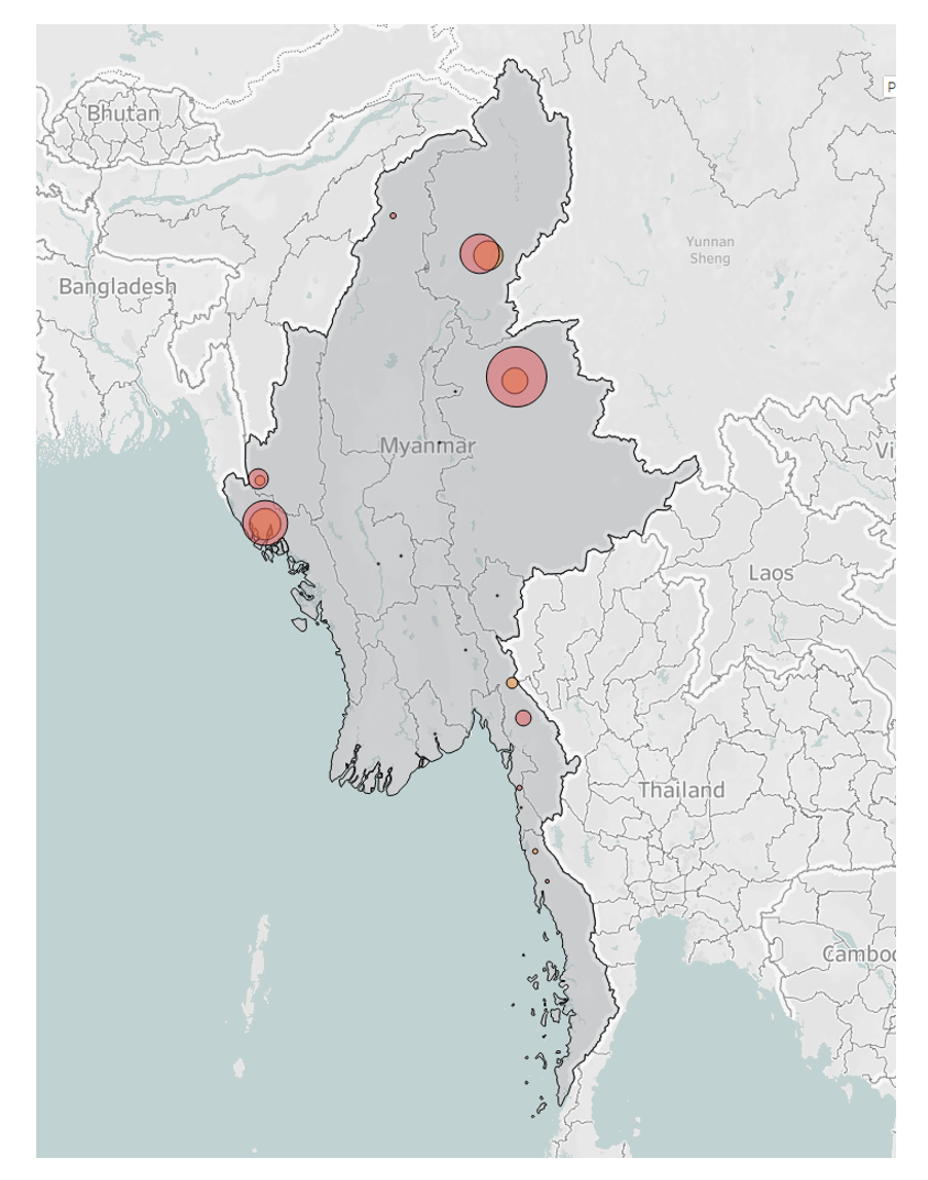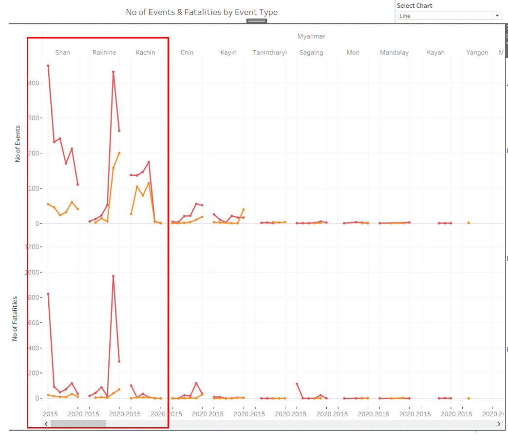 such as Shan, Rakhine and Kachin battlefronts. The intense battle with Arakan Army in Rakhine state escalated in 2019 resulted increase in number of battle events in 2019 to 2020. https://asiatimes.com/2019/01/arakan-army-clashes-with-government-forces-in-rakhine-state/
