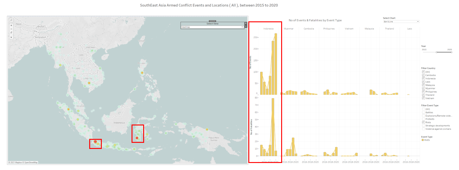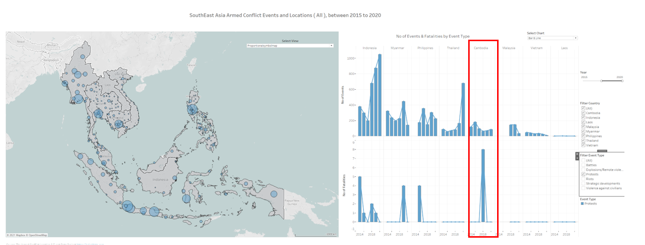 And when we filter by protest, we can see the major cluster of the protest cluster in the SEA region cross the years from 2015 to 2020. The fatalities are much lesser compared with the other events with most noticeable of highest 8 counts death come from protests in Cambodia 2018 despite having much lesser protest event in the region.