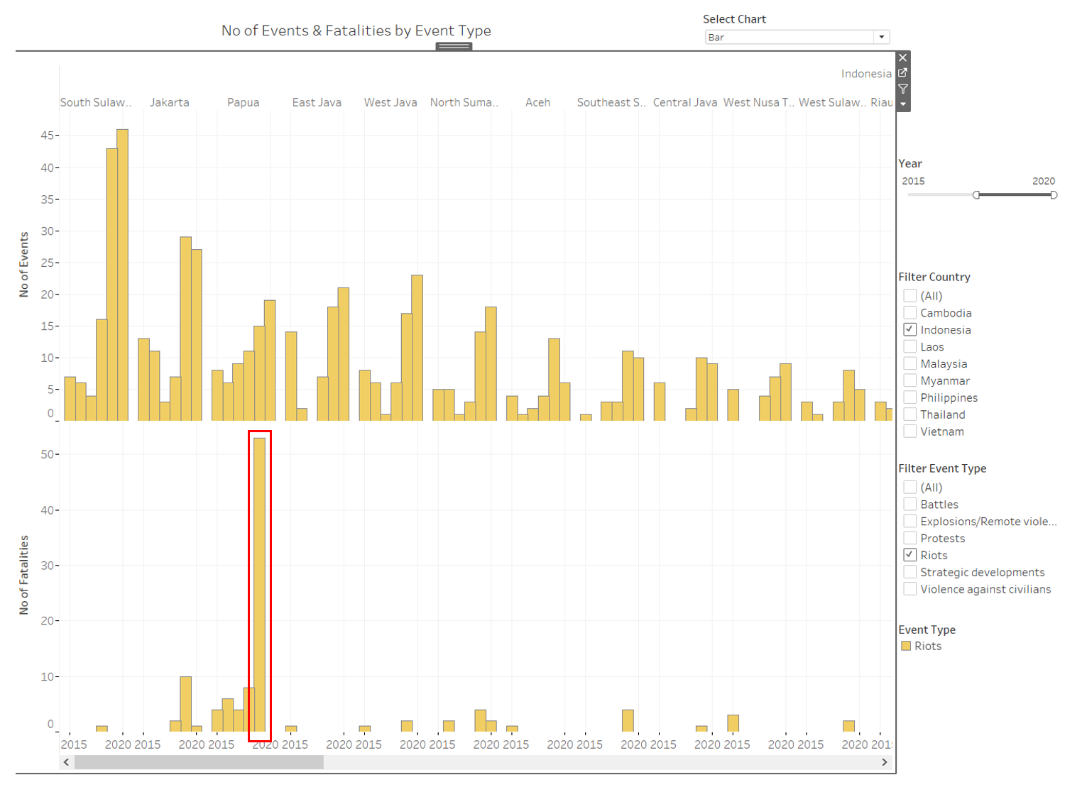 Which after drilling down to states, the fatalities are mainly contributed to Papua’s Riot in 2019, having 53 deaths of total 79. https://www.hrw.org/news/2019/10/07/indonesia-investigate-riot-deaths-papua